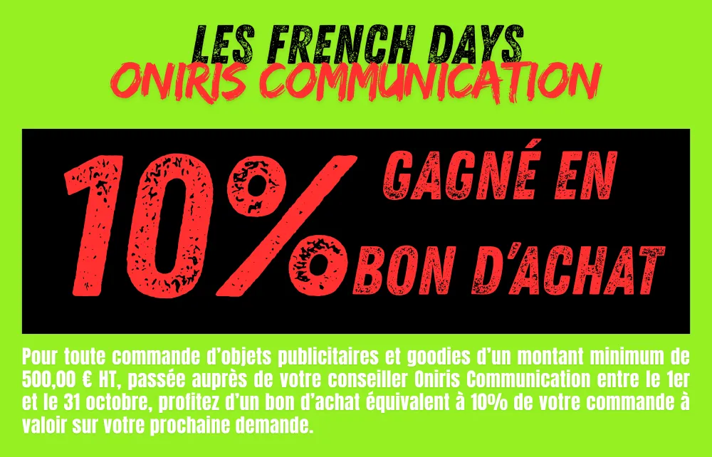 👉 Du 1er au 31 octobre, pour toute commande d’un minimum de 500,00€ HT passée auprès de votre conseiller Oniris, bénéficiez immédiatement de 10% de la valeur de votre commande en bon d’achat, à utiliser sur votre prochaine demande chez Oniris Communication.
