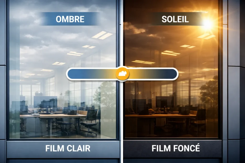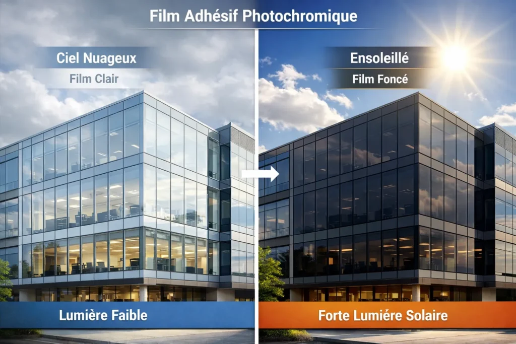 Avec l’évolution des technologies de vitrage, il est désormais possible d’installer des films photochromiques capables de s’adapter automatiquement à la luminosité extérieure. Leur principe est simple et ingénieux : plus le soleil est intense, plus le film se fonce. À l’inverse, lorsque la lumière baisse, il redevient plus clair.